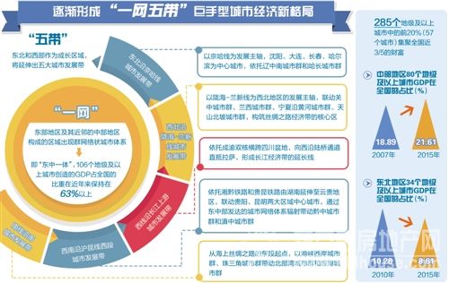 從城市層面GDP空間分布及變化來看,中國東中一體與“一網(wǎng)五帶”經(jīng)濟空間新格局進一步凸現(xiàn)。主要表現(xiàn)在:第一,中心城市的經(jīng)濟集聚引領作用進一步增強,285個地級及以上城市中的前20%(57個城市)集聚全國近3/5的財富。第二,中部地區(qū)憑借中心城市的有力支撐正在不斷崛起,東北地區(qū)由于中心城市支撐作用下降而出現(xiàn)持續(xù)下滑。第三,“一網(wǎng)五帶”的“巨手型”城市中國經(jīng)濟空間格局進一步顯現(xiàn)。東中部多中心城市群網(wǎng)中106個地級及以上城市創(chuàng)造的GDP占全國的比重在近年來保持在63%以上。西線沿長江上游城市發(fā)展帶GDP比重持續(xù)增加,2015年達到了6.28%,有趕超東北沿京哈線城市發(fā)展帶的可能。西北沿隴海蘭新線城市發(fā)展帶、西南沿滬昆線西段城市發(fā)展帶、南線沿海城市發(fā)展帶在全國的GDP比重盡管相對較小,但總體上呈增加趨勢。