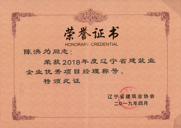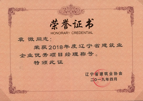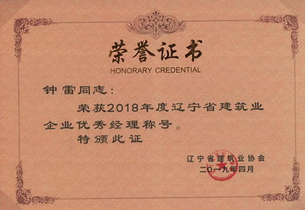 2019年5月22日,從遼寧省建筑業(yè)協(xié)會獲悉,我集團榮獲2018年度“遼寧省建筑業(yè)優(yōu)秀企業(yè)”稱號。副總經(jīng)理鐘雷同志榮獲“遼寧省建筑業(yè)企業(yè)優(yōu)秀經(jīng)理”稱號,項目經(jīng)理李桂忱、陳洪為、袁微三名同志榮獲“遼寧省建筑業(yè)企業(yè)優(yōu)秀項目經(jīng)理”稱號。
