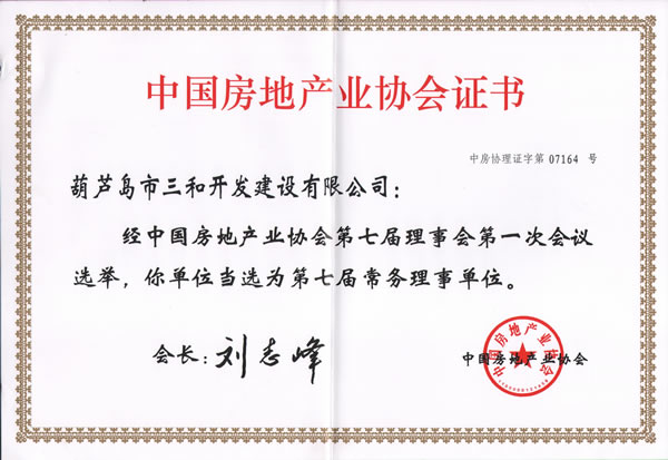 2014年5月13日中國房地產協(xié)會第七次會員代表大會在北京召開,葫蘆島市三和開發(fā)建設有限公司當選為中國房地產協(xié)會第七屆常務理事單位。