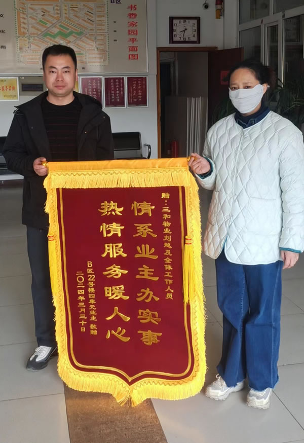 近日,書香家園B區(qū)一業(yè)主親手將一面繡有“情系業(yè)主辦實(shí)事 熱情服務(wù)暖人心”的錦旗贈送給三和物業(yè)團(tuán)隊,以表達(dá)對他們在處理下水道堵塞問題上所展現(xiàn)出的高效服務(wù)和專業(yè)務(wù)實(shí)態(tài)度的高度贊揚(yáng)與深深感謝。