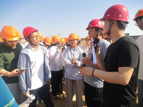 施工現(xiàn)場,于海部長向同學(xué)們詳細(xì)介紹了項目工程概況、工程進(jìn)度、設(shè)計理念等內(nèi)容,段文博向同學(xué)們介紹了施工工藝和當(dāng)前土方回填、基礎(chǔ)施工等情況。參觀過程中對同學(xué)們提出的問題進(jìn)行現(xiàn)場解答,確保理論與實踐融合,讓參觀學(xué)習(xí)走實又走心。