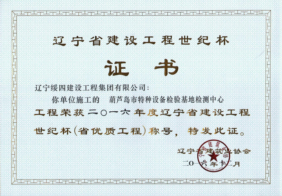 “葫蘆島市特種設(shè)備檢驗基地檢測中心”榮獲2016年度遼寧省建設(shè)工程世紀杯稱號