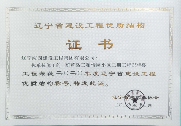 “葫蘆島三和恬園小區(qū)二期工程29#樓”榮獲2020年度遼寧省建設(shè)工程優(yōu)質(zhì)結(jié)構(gòu)稱號(hào)