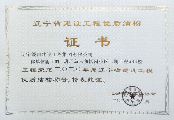 “葫蘆島三和恬園小區(qū)二期工程24#樓”榮獲2020年度遼寧省建設(shè)工程優(yōu)質(zhì)結(jié)構(gòu)稱號