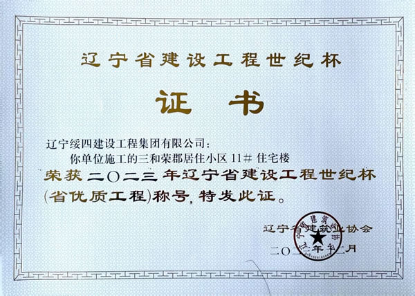 榮獲二0二三年遼寧省建設(shè)工程世紀(jì)杯(省優(yōu)質(zhì)工程)稱號