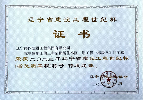 三和榮郡居住小區(qū)二期工程一標(biāo)段9#住宅樓 榮獲2023年遼寧省建設(shè)工程世紀(jì)杯(省優(yōu)質(zhì)工程)稱號