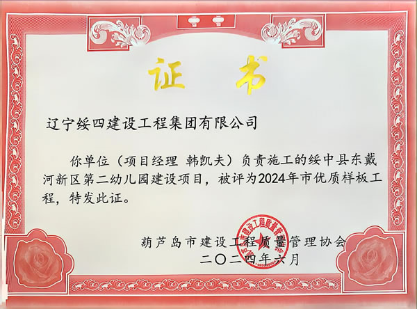 綏中縣東戴河新區(qū)第二幼兒園建設(shè)項(xiàng)目被評(píng)為2024年市優(yōu)質(zhì)樣板工程